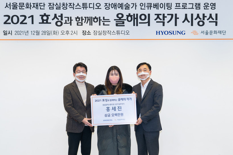 ▲ 서울문화재단 이창기 대표이사(좌)와 수상자 홍세진 작가(가운데) 효성 커뮤니케이션실 최형식 상무가 시상식 기념 촬영을 하고 있다. (사진=효성) |