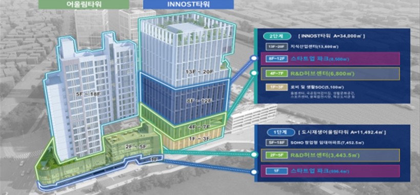 그린 스타트업 타운은 창업기업의 성장주기별 지원을 위해 스타트업 파크(창업기업 입주공간), 복합허브센터, 지식산업센터(성장기업 입주공간)로 구성된다.