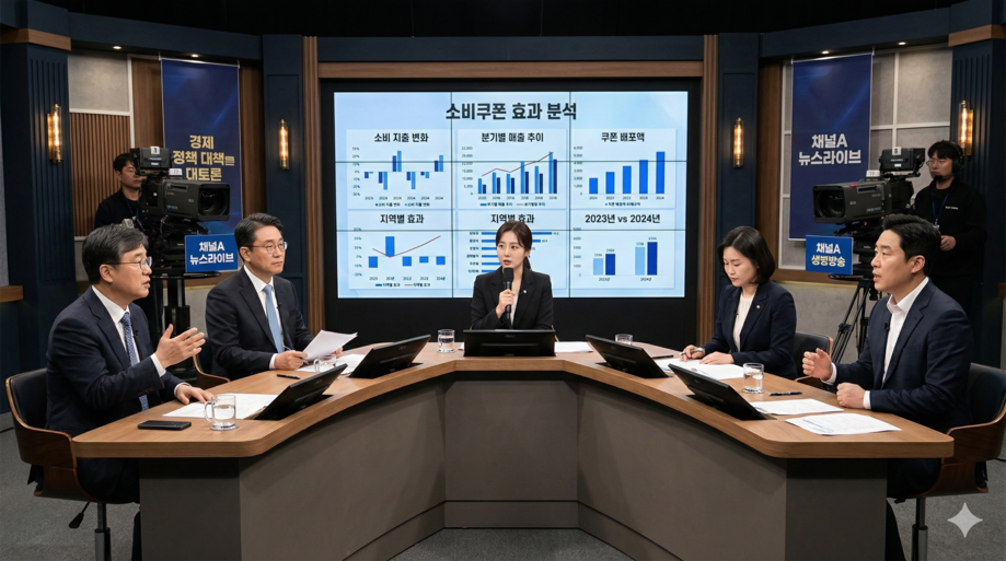 | ▲ 위 사진은 기사 내용과 무관하게 AI(인공지능)가 생성한 이미지입니다. 소비쿠폰 정책 효과를 놓고 토론하는 전문가 패널. (사진 = 챗GPT) |