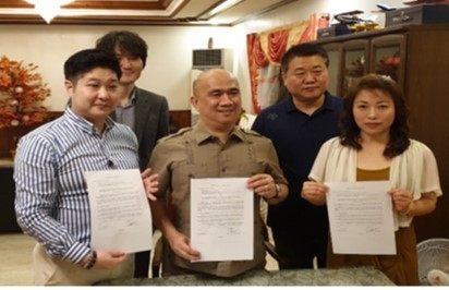 ▲ 인수추진위원단 단장 안승혁(좌측)과 Jose ramon Rural bank 회계 감사겸 인수위원 bien constantino(중앙)이 실무 협약 체결 후 포즈를 취하고 있다. |