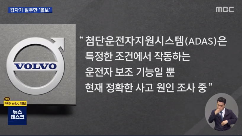 지난 5일 'MBC뉴스'는 50대 운전자 A씨가 반 자율주행 기능이 오작동 한 차량 시스템의 결함으로 인해 발생한 급발진 사고라고 주장하며, 볼보를 상대로 2억여 원의 손해배상 소송을 제기했다고 보도했다.