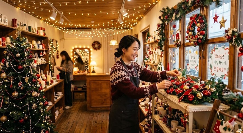 | ▲ 위 사진은 기사 내용과 무관하게 AI(인공지능)가 생성한 이미지입니다. 크리스마스 분위기로 고객을 맞이하는 소상공인 매장. (사진 = 제미나이) |