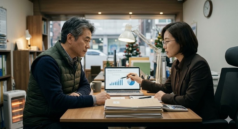 | ▲ 위 사진은 기사 내용과 무관하게 AI(인공지능)가 생성한 이미지입니다. 연간 경영 실적을 점검하는 소상공인과 회계사. (사진 = 제미나이) |