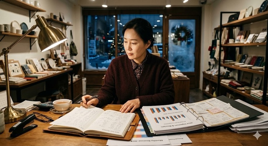 | ▲ 위 사진은 기사 내용과 무관하게 AI(인공지능)가 생성한 이미지입니다. 연간 경영 실적을 정리하는 소상공인 사장님. (사진 = 제미나이) |