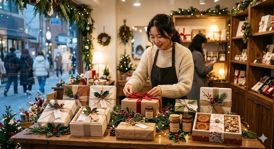 | ▲ 위 사진은 기사 내용과 무관하게 AI(인공지능)가 생성한 이미지입니다. 12월 선물 시장을 노리고 선물 상품을 정리하는 소상공인. (사진 = 제미나이) |