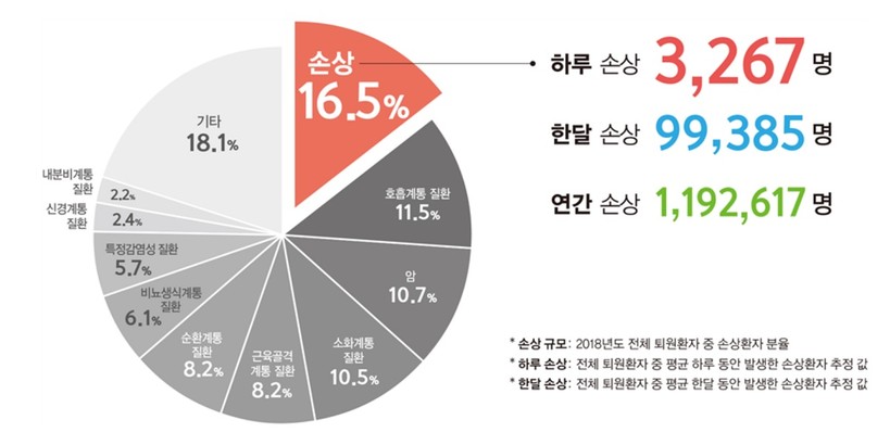 질병관리청에 따르면 전체 입원환자 중 손상환자는 16.5%로 연간 119만2617명이 입원했다. 하루를 기준으로 계산하면 평균 3267명 수준이다.