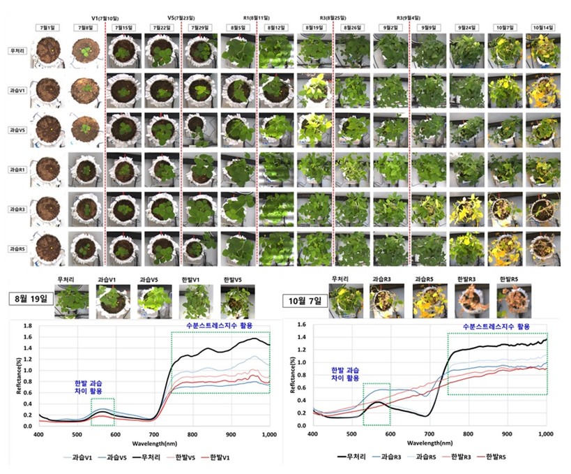 ▲ 생육시기별 가뭄 처리에 따른 콩의 생육과 영상 분석. (사진=농촌진흥청) |