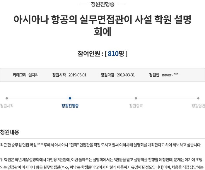 앞서 지난 1일 청와대 청원게시판에는 '아시아나항공의 실무면접관이 사설 학원 설명회에'라는 제목의 폭로글이 올라왔다. 해당 글에는 7일 오후 3시 기준으로 810명이 동의했다.
