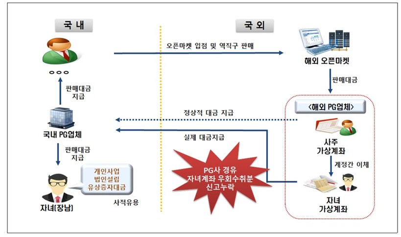 # B씨는 국내외 오픈마켓(온라인 쇼핑몰)을 통해 화장품과 잡화 등을 판매하고 있는 개인사업자로 해외 오픈마켓의 역직구를 통해 발생한 수입금액을 역외에서 가상계좌로 수취한 후 자녀(장남)의 가상계좌와 국내 PG사를 거쳐 국내로 변칙반입하고, 이를 전액 신고 누락했다.
