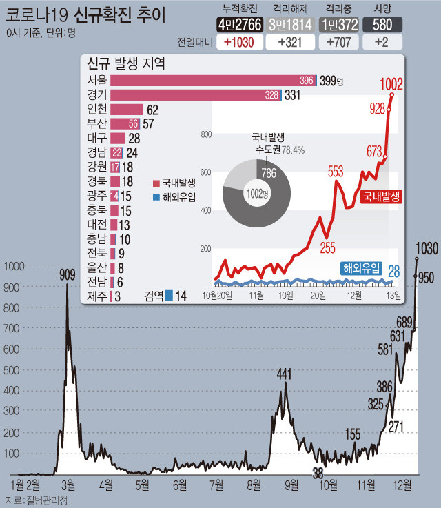 질병관리청 중앙방역대책본부(방대본)에 따르면 이날 0시 기준 신규 확진자는 1030명으로 집계됐다. 하루 1000명대 신규 확진자 발생은 지난 1월20일 코로나19 국내 유입 이후 11개월여 만에 처음이다.