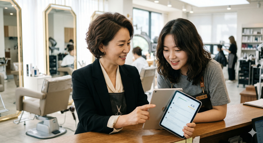 | ▲ 위 사진은 기사 내용과 무관하게 AI(인공지능)가 생성한 이미지입니다. 고객 리뷰를 꼼꼼히 관리하는 미용실 사업주. 리뷰가 곧 신뢰도와 매출이다. (사진 = 제미나이) |