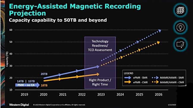 이런 가운데 웨스턴디지털은 적어도 2023년까지 24TB에서 2026년에는 최대 60TB용량을 지원하는 제품을 내놓겠다고 로드맵을 발표했다.