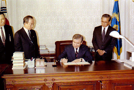 ▲ 노태우 전 대통령이 26일 서거했다. 노 전 대통령은 지병으로 오랜 병상 생활을 해왔다. 최근 병세 악화로 서울대병원에 입원에 치료를 받았지만 끝내 눈을 감았다. 사진은 1991년 노태우 대통령이 UN헌장 의무수락 선언서에 서명을 하는 모습. (사진=뉴시스) |