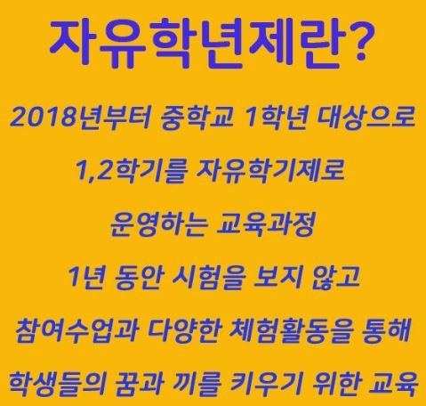 현재 중학생들은 ‘자유학기제’에 이어 ‘자유학년제’ 확장에 따라 1년 동안 시험 부담에서 벗어나 토론, 실습, 체험활동 등에 참여한다. 이를 통해 꿈과 끼를 키우며 진로 탐색 시간을 갖는다.