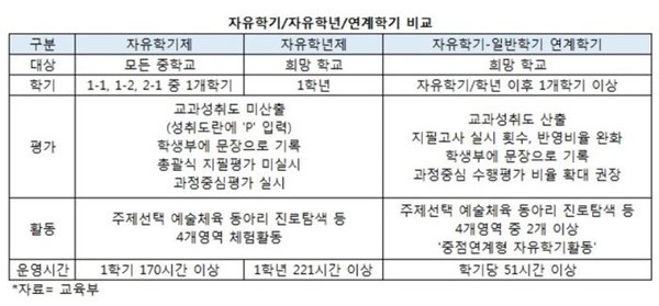 자유학년제와 별도로 2013~2015년 시범 운영을 거쳐 2016학년부터 전국에 도입된 자유학기제는 올해 3210개 모든 중학교에서 운영한다. 자유학기제 실시 학교 중 500여 개교는 연계학기, 1500여 개교는 자유학년제로 확대 운영하기에 이른 것이다.