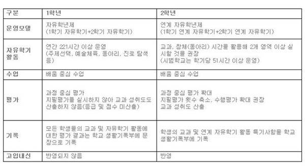 자유학년제(학기제)가 운영되는 동안 교과 시간이 제약되는 것은 아니다. 교과목 수업 시간 일부가 자율과정으로 편입되면서 활동 중심의 수업이 늘어나는 방식이다. 이 과정에서 교과수업이 일주일에 약 8시간가량 줄기에 수업에 대한 진도가 다소 빠르게 진행될 수 있어 수업전 예습과 복습습관이 매우 중요하다.
