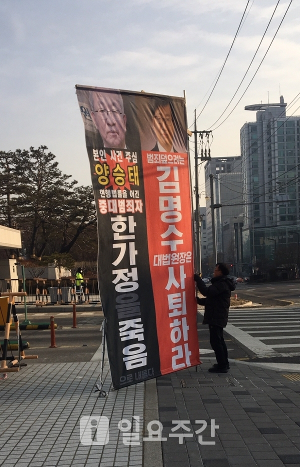 [소상공인포커스=이수근 기자] 이른바 '사법농단' 사태의 몸통으로 지목받고 있는 양승태 전 대법원장이 피의자로 검찰 조사를 받게 된 11일 오전 서울 서초동 대법원 앞에는 양 전 대법원장의 구속을 촉구하는 시민사회단체의 구호가 빗발쳤다. 이날 김명수 대법원장은 굳은 표정으로 출근했다.